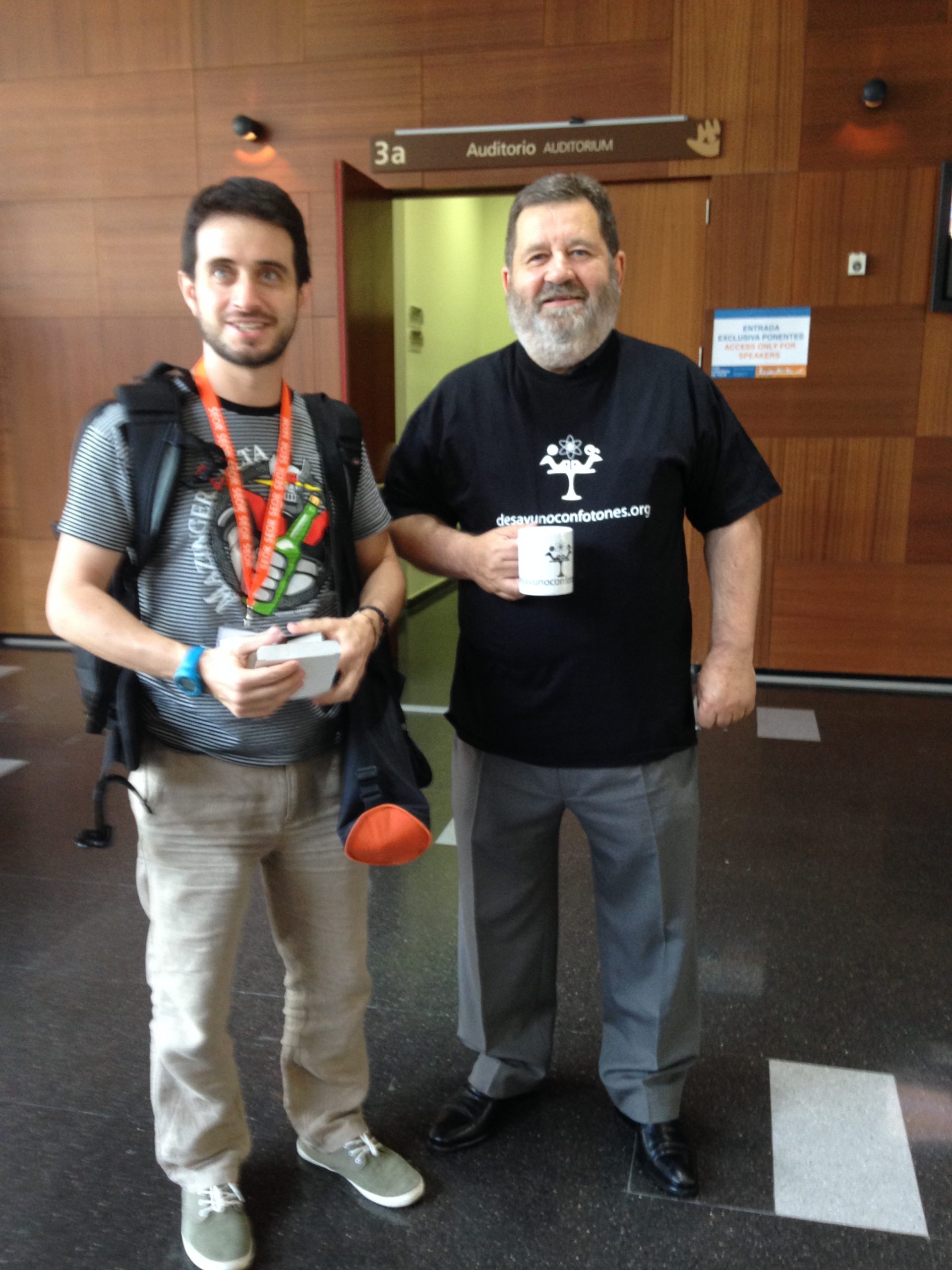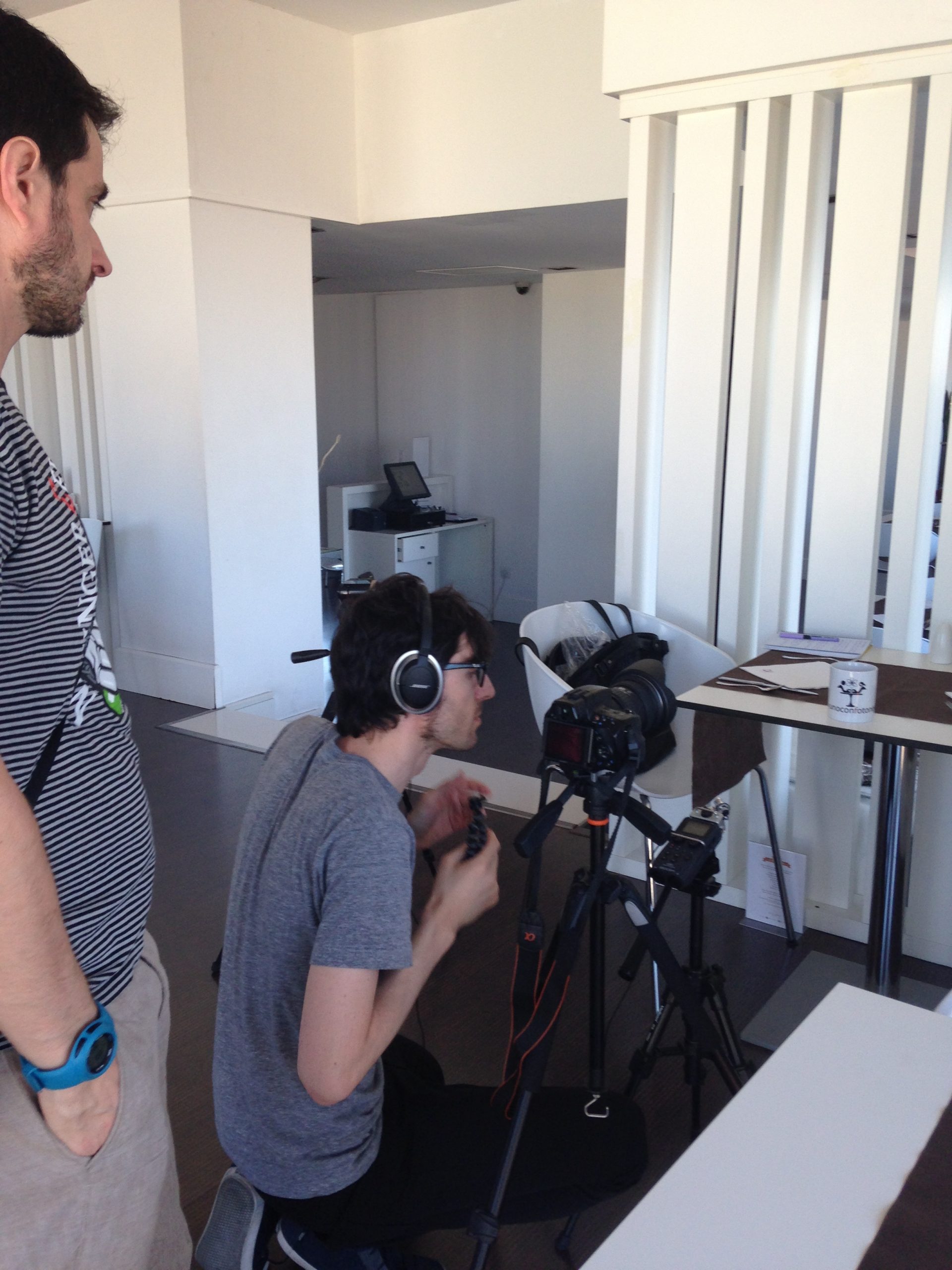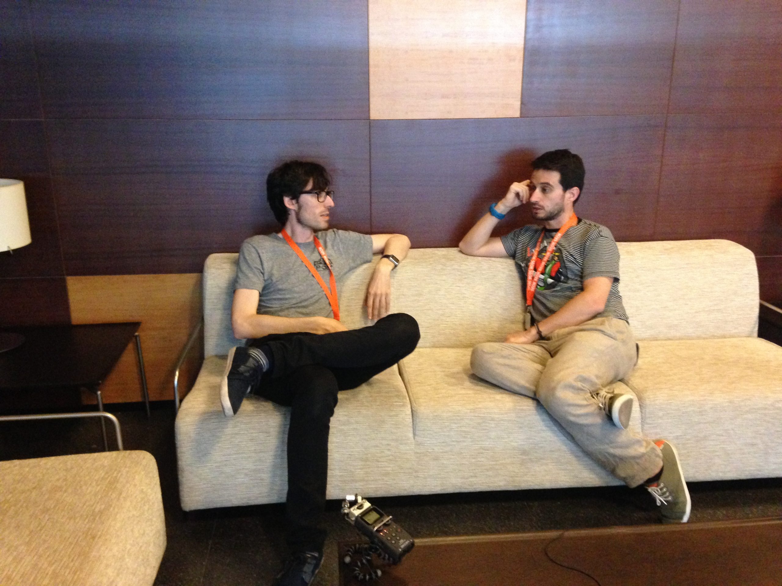 Imaginaos la situación. Llegar al centro donde tenía lugar el evento, buscar dónde realizar las entrevistas, ajustar horarios, que si aquí hay demasiado ruido ambiental, que si este sitio no mola porque el fondo es muy plano, que se les acaba la batería y no tienen repuesto… Todo eran situaciones nuevas donde tenían que improvisar decorados, encuadres fijos y móviles, el registro del audio… Todo muy excitante e intenso, con momentos memorables. El primer día cometieron todos los errores del mundo (incluido grabar un audio prácticamente irrecuperable para cuyo filtrado habrá que contactar con los más avezados técnicos de CSI). El segundo día ya montaban el equipo y decidían las ubicaciones en menos de 5 minutos y habían ganado la soltura y confianza como para invadir la zona VIP para grabar.. (esto no sé si se podía contar…)